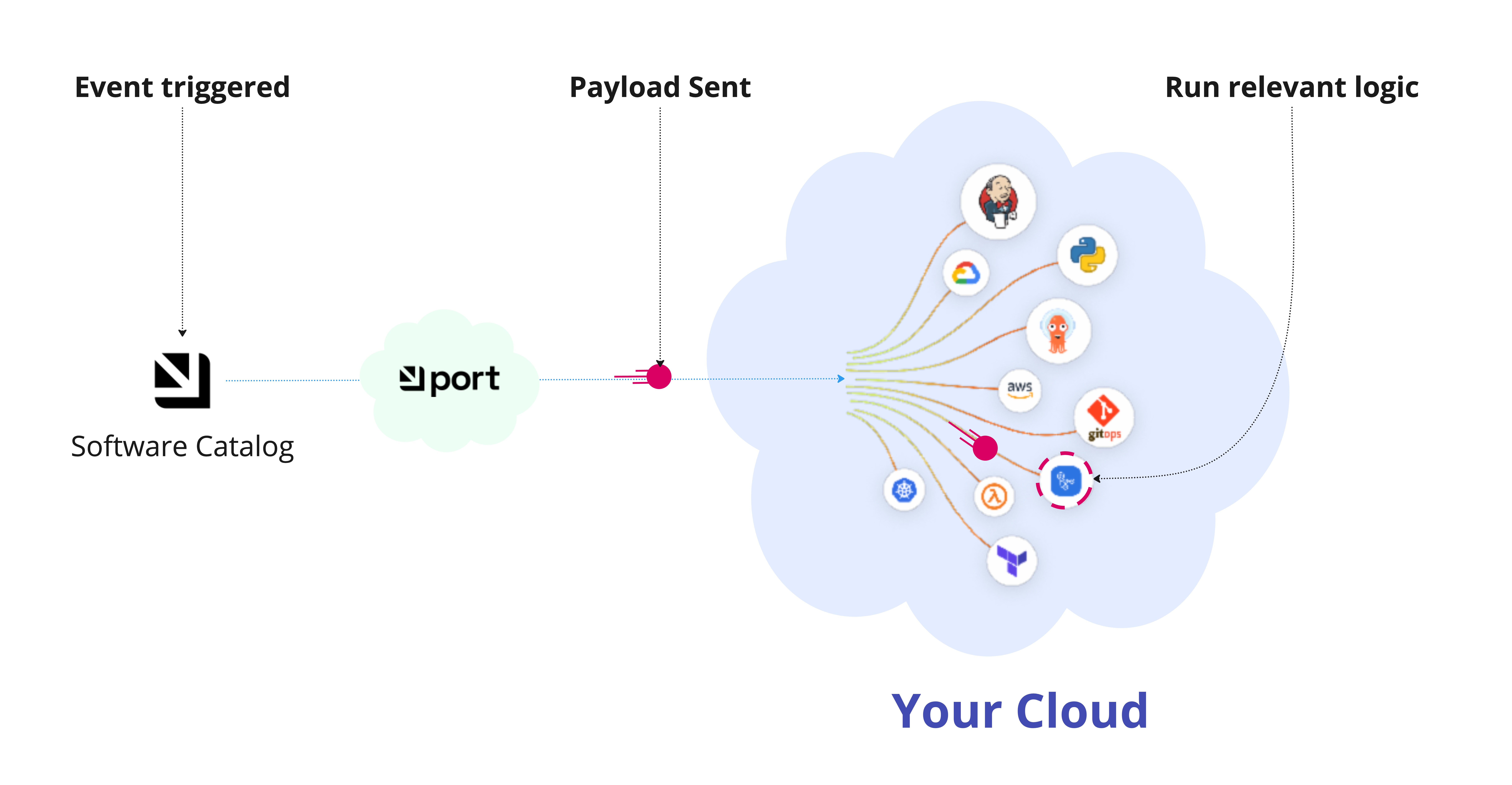 Automations in Port are triggered by events in your infrastructure, such as a new service being created, a cloud account being provisioned, or a new package being added to your software catalog. These events can be used to trigger a pre-defined backend running any logic, such as updating your software catalog, sending notifications, or provisioning new resources.