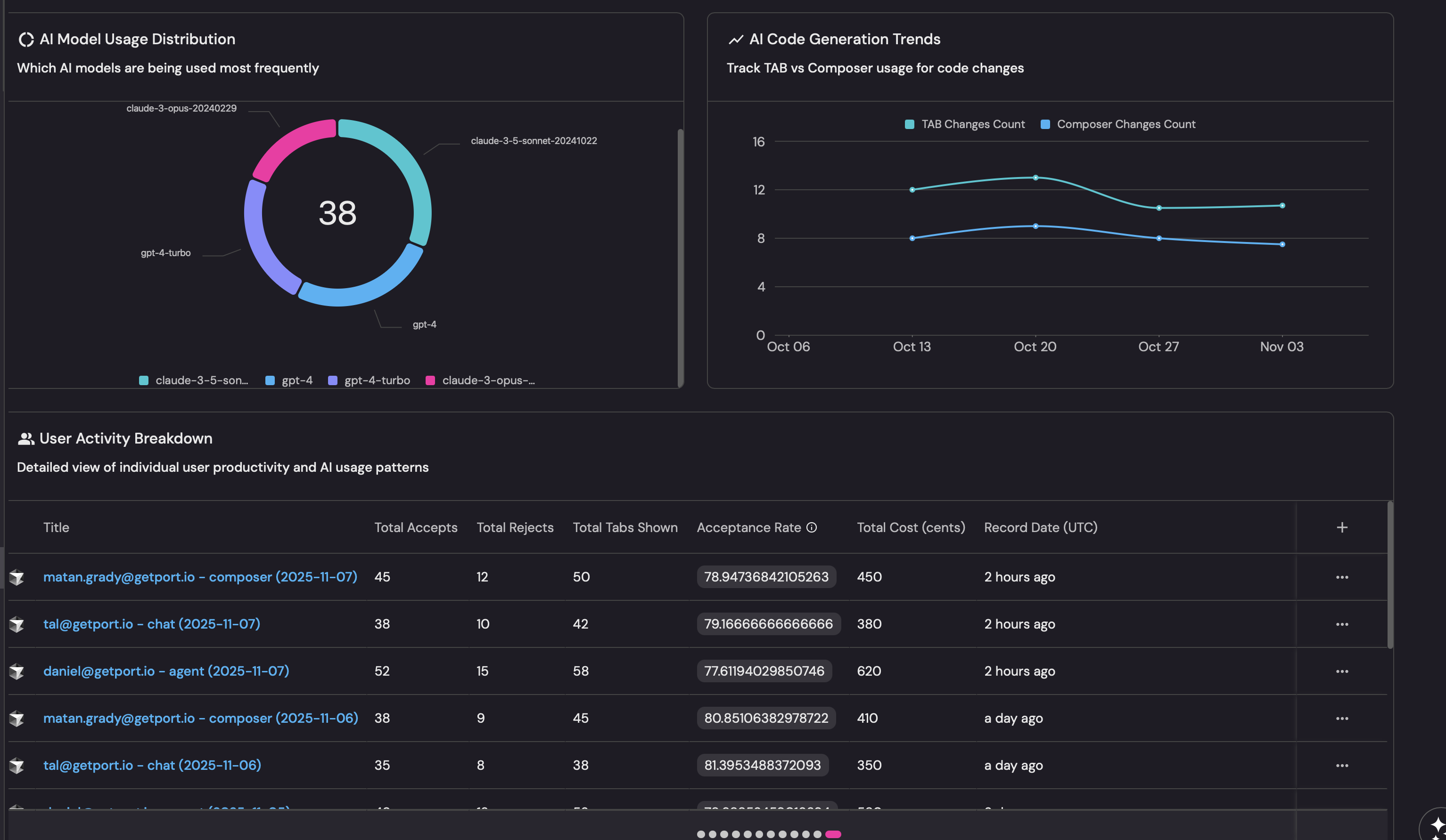 • Description: Detailed view of individual user productivity and AI usage patterns.