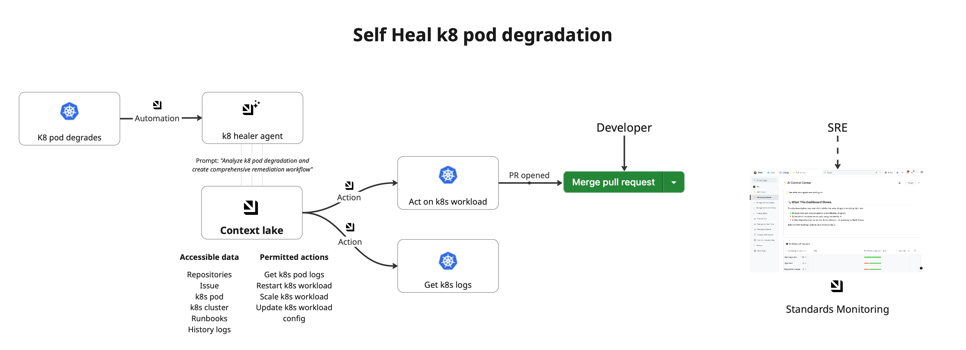 The AI agent follows a guided process to first retrieve pod logs, combine them with SDLC context, intelligently determine the root cause, and execute targeted fixes like restarts, scaling, or configuration updates.