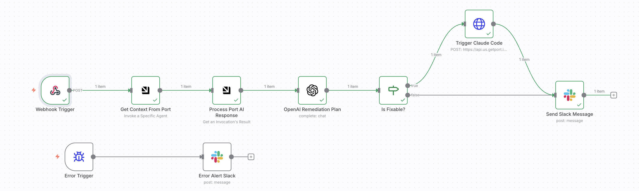 6. Trigger Claude Code — (Optional) Triggers automated code fix via Port action