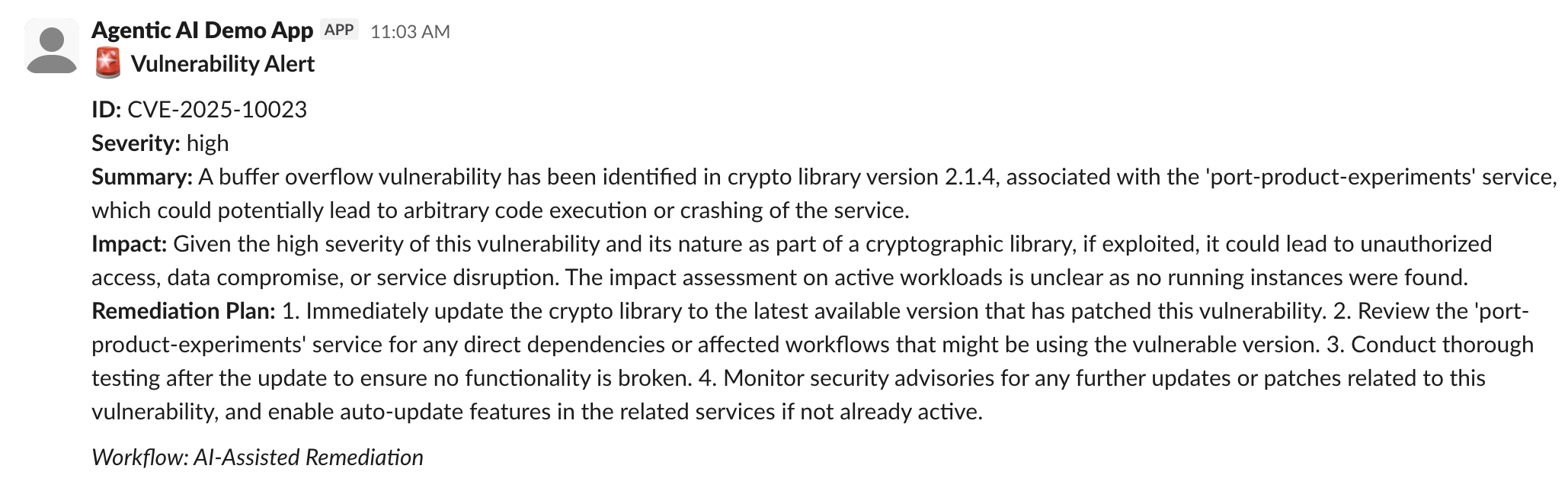 "text": "={{ \n`🚨 *Vulnerability Alert*\n\n*ID:* ${$('Webhook Trigger').item.json.body.vulnerability_id}\n*Severity:* ${$('Webhook Trigger').item.json.body.severity}\n*Summary:* ${$node[\"OpenAI Remediation Plan\"].json[\"message\"][\"content\"].parseJson().summary}\n*Impact:* ${$node[\"OpenAI Remediation Plan\"].json[\"message\"][\"content\"].parseJson().impact}\n*Remediation Plan:* ${$node[\"OpenAI Remediation Plan\"].json[\"message\"][\"content\"].parseJson().remediation_plan}\n\n_Workflow: AI-Assisted Remediation_`\n}}\n",