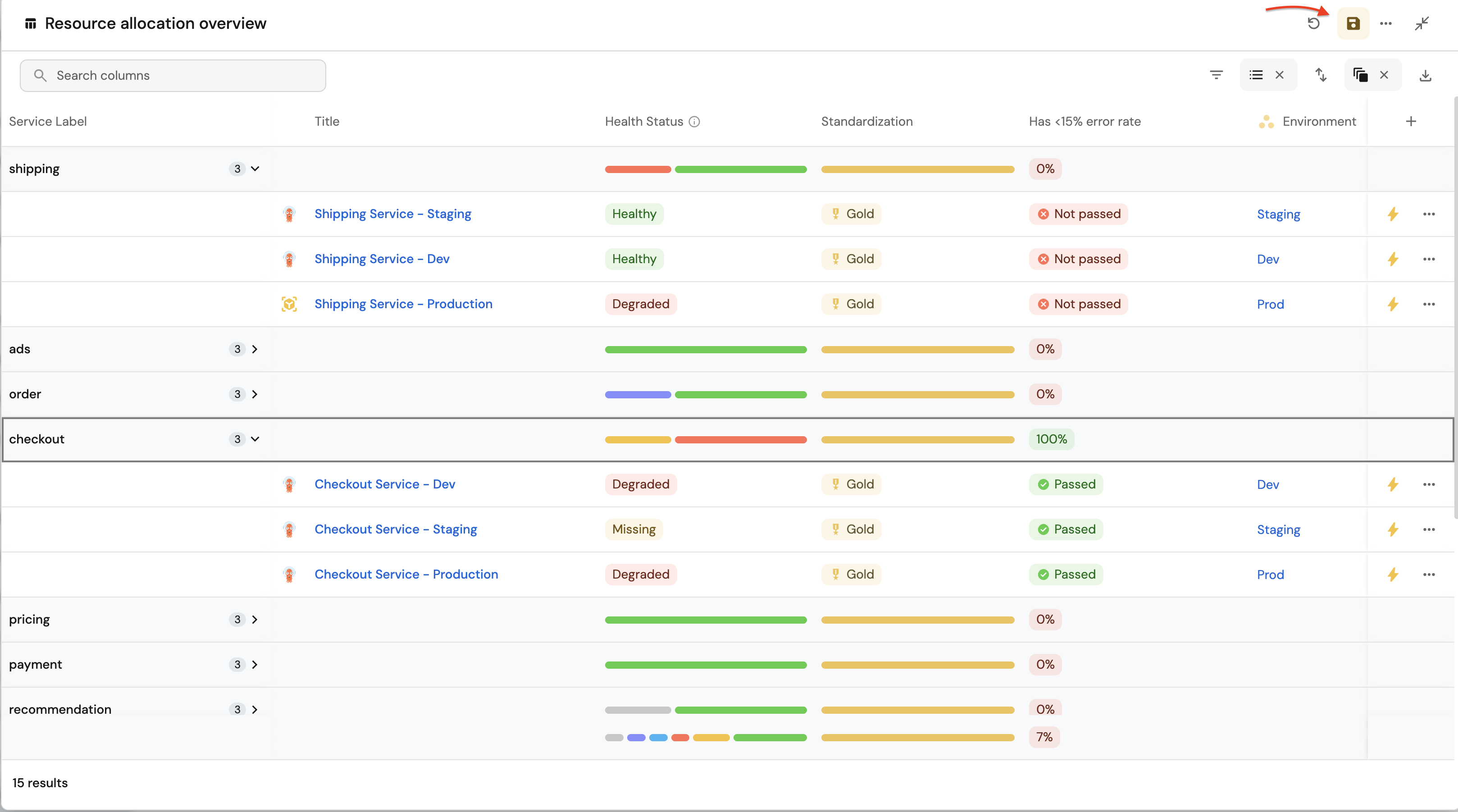 Customize your views to display the data that matters to you, grouped or filtered by teams, namespaces, or any other criteria.